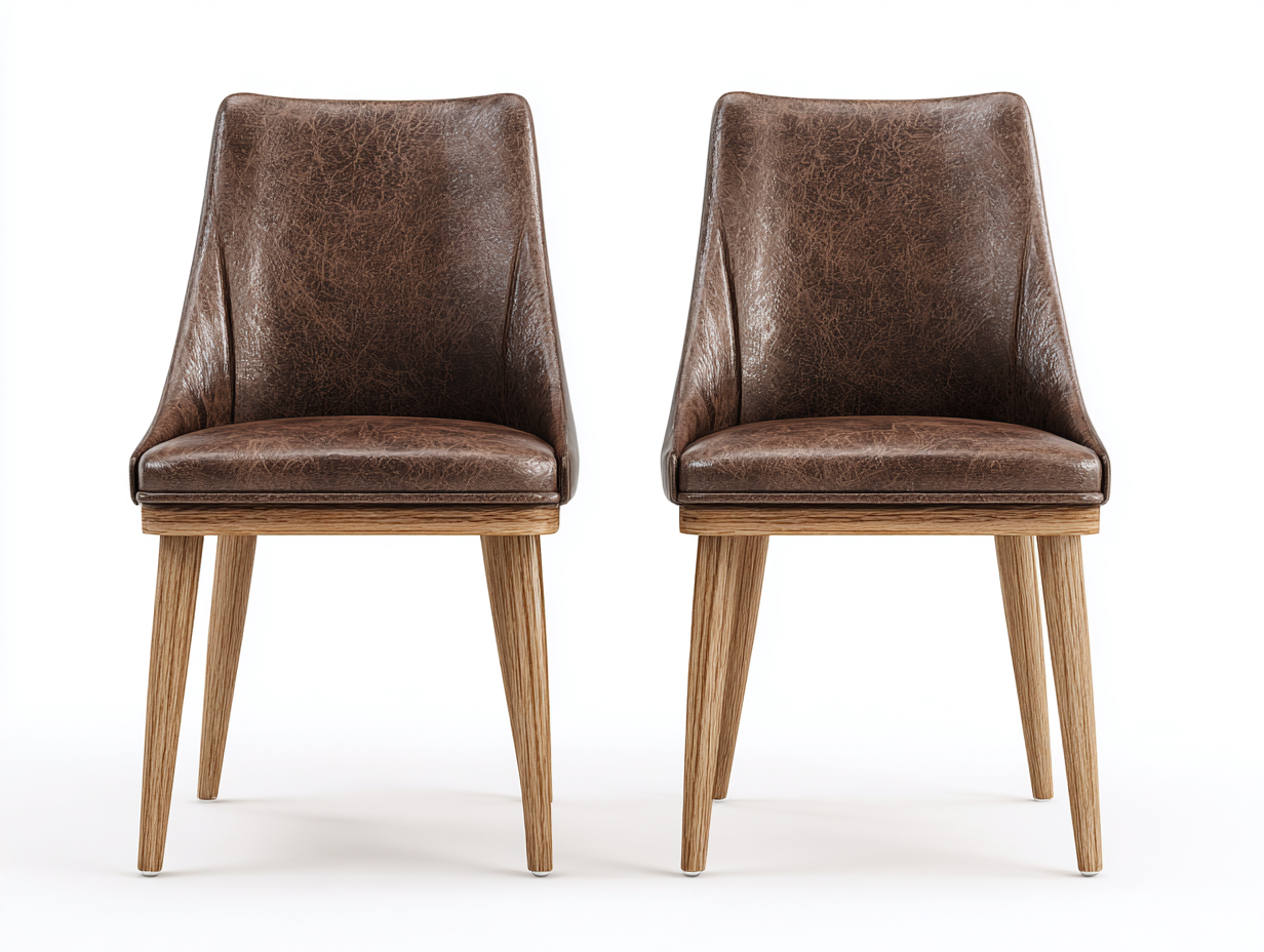 The chairs are upholstered in faux leather with a textured surface in a brown colour. The legs are crafted from solid wood with a natural wood finish, offering stability, durability, and a warm visual contrast for indoor use.