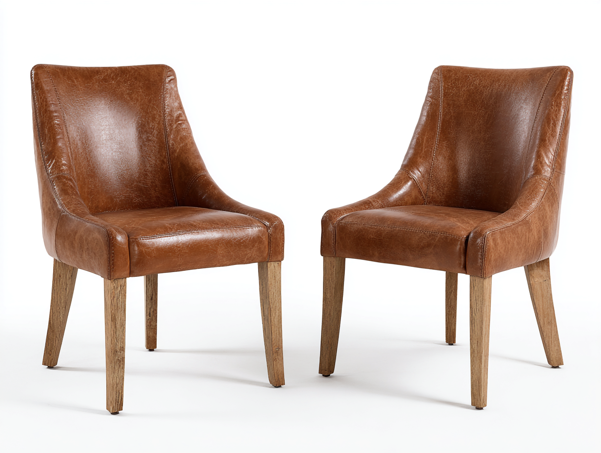 The chairs are upholstered in leather with a smooth, slightly textured surface in a tan colour. The legs are made from solid wood with a natural wood finish, offering stability, durability, and a warm visual contrast for indoor use.