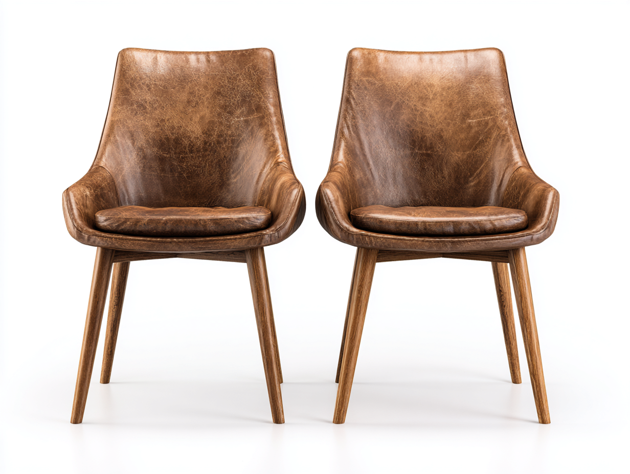 The chairs feature leather upholstery finished in brown with a smooth surface. The legs are crafted from solid wood to provide stable support for everyday dining use.