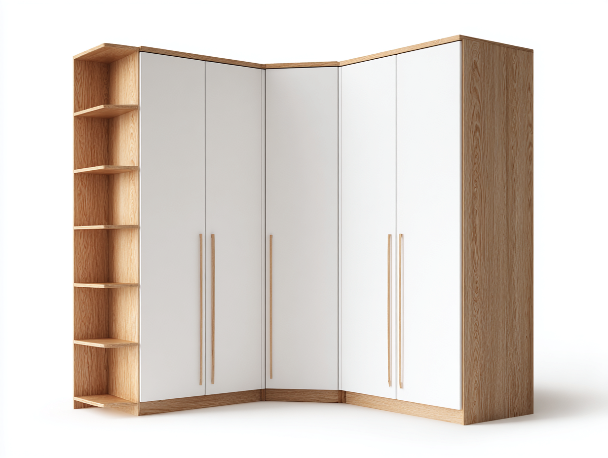 This wardrobe is designed for bedroom storage with a corner layout that maximizes available space. The structure combines enclosed cabinet sections with open shelving for efficient daily organization.